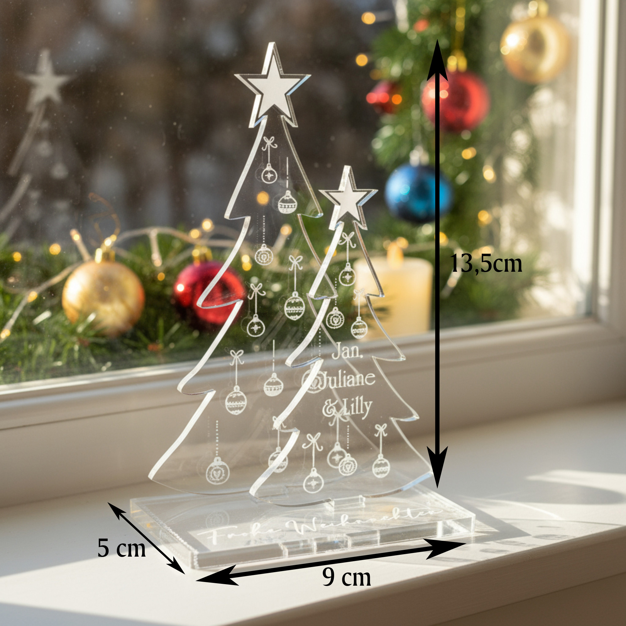 Festliche Deko im skandinavischen Stil – Minimalistisches Design in transparenter Optik. Ideal als moderne Weihnachtsdeko im Wohnzimmer, Büro oder auf der Fensterbank – perfekt kombinierbar mit Holz- oder LED-Elementen.