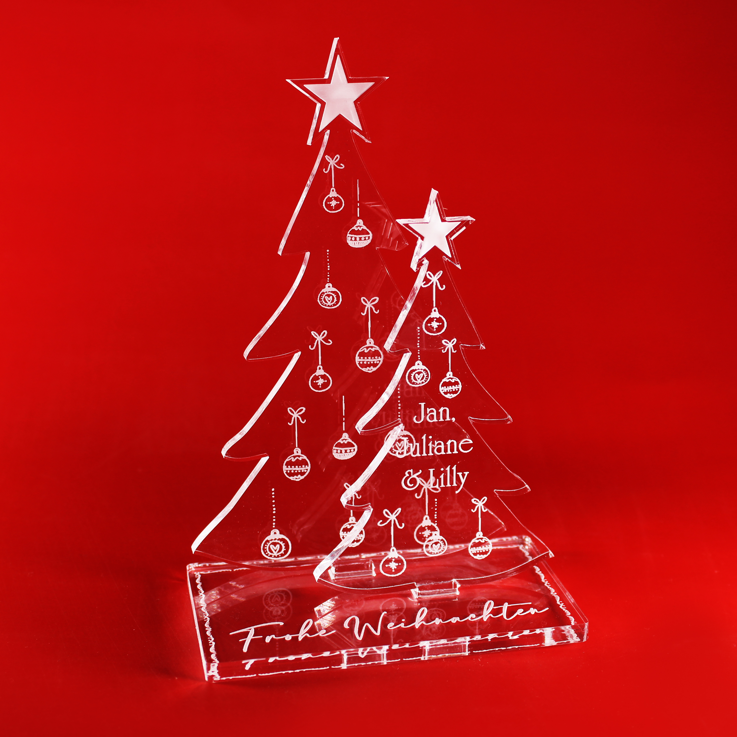 Acryl Aufsteller mit zwei Tannenbäumen – personalisierbare Weihnachtsdeko aus klarem Plexiglas mit weißer Gravur