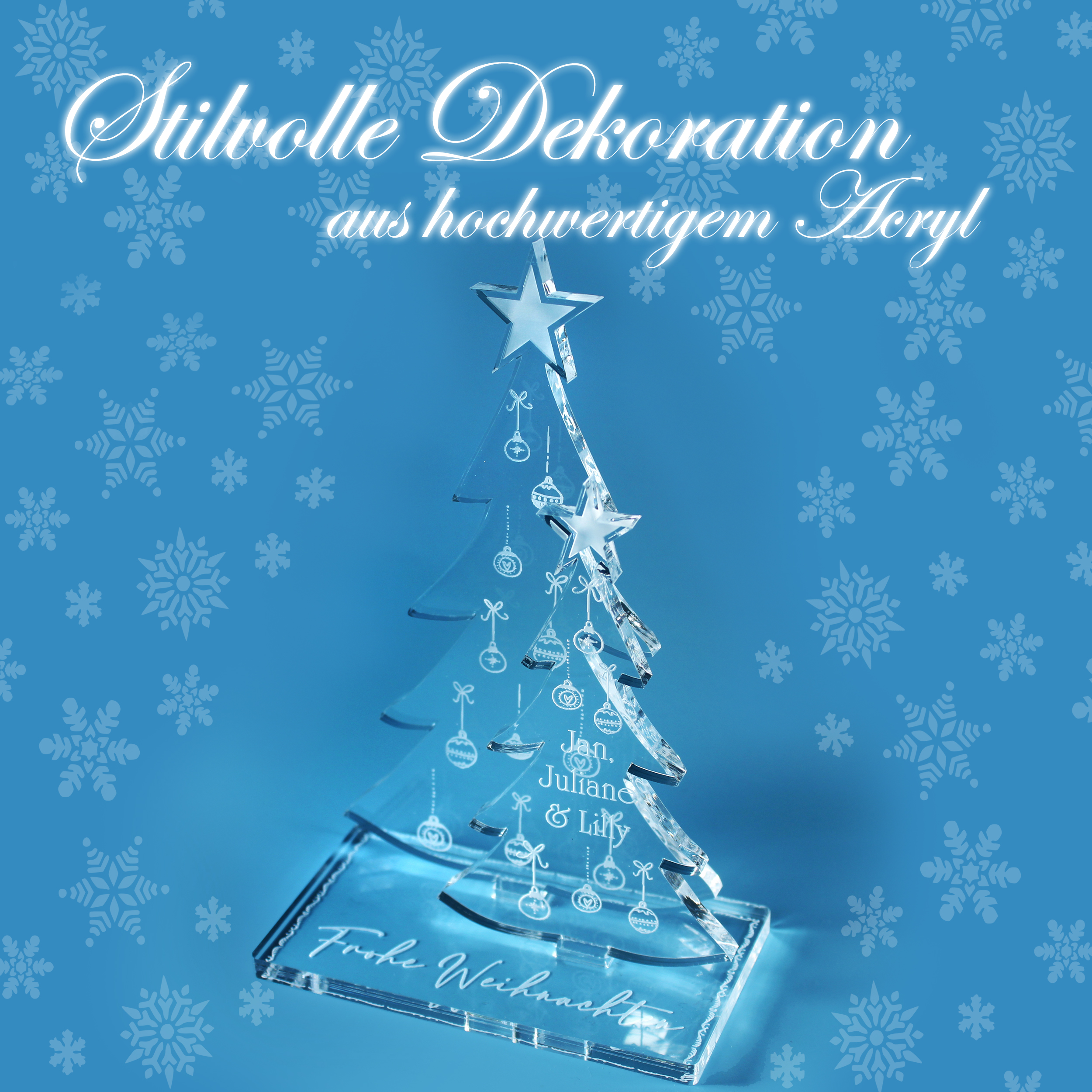 Gefertigt aus stabilem Plexiglas (Acryl) mit präziser CO₂-Lasergravur, überzeugt der Aufsteller durch hohe Qualität und Langlebigkeit. Die Kombination aus klarem Material und weißer Gravur sorgt für eine besonders elegante, winterliche Ausstrahlung.