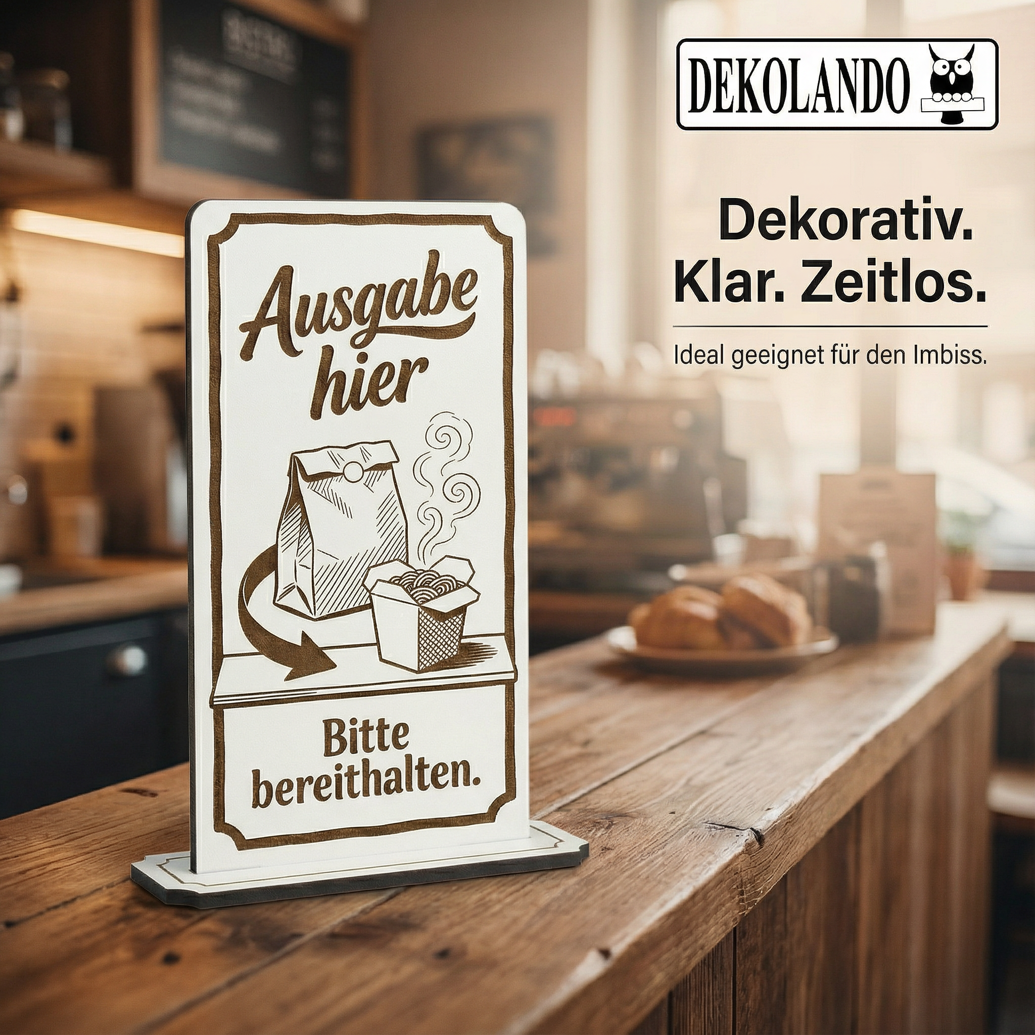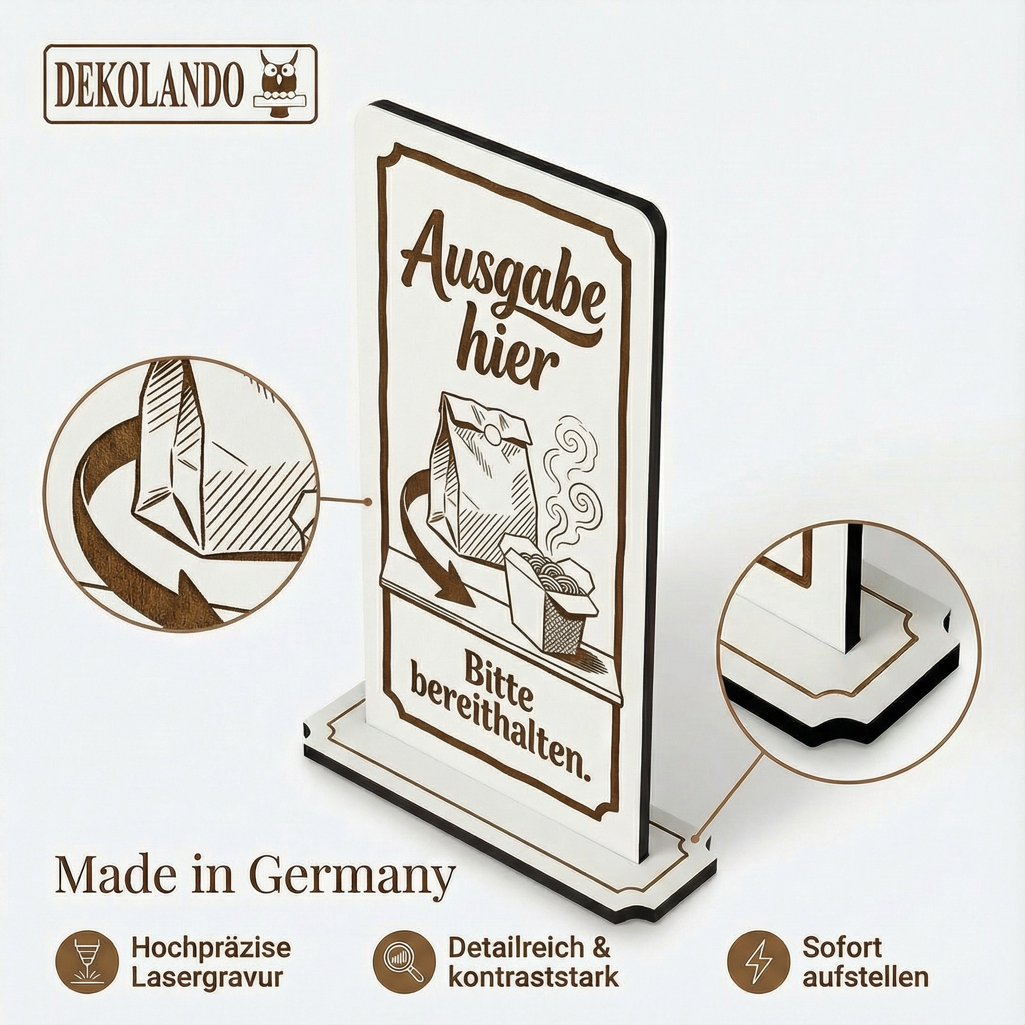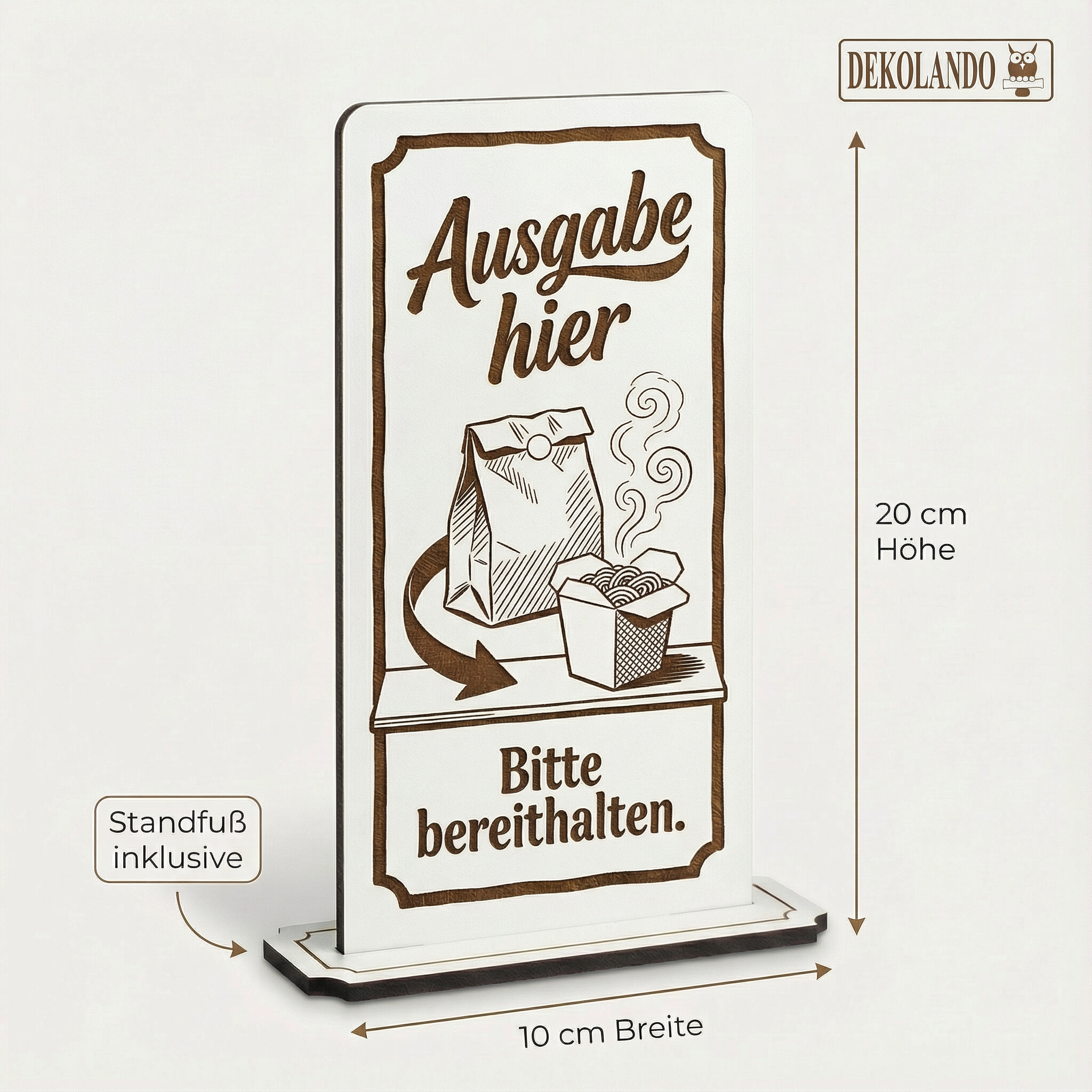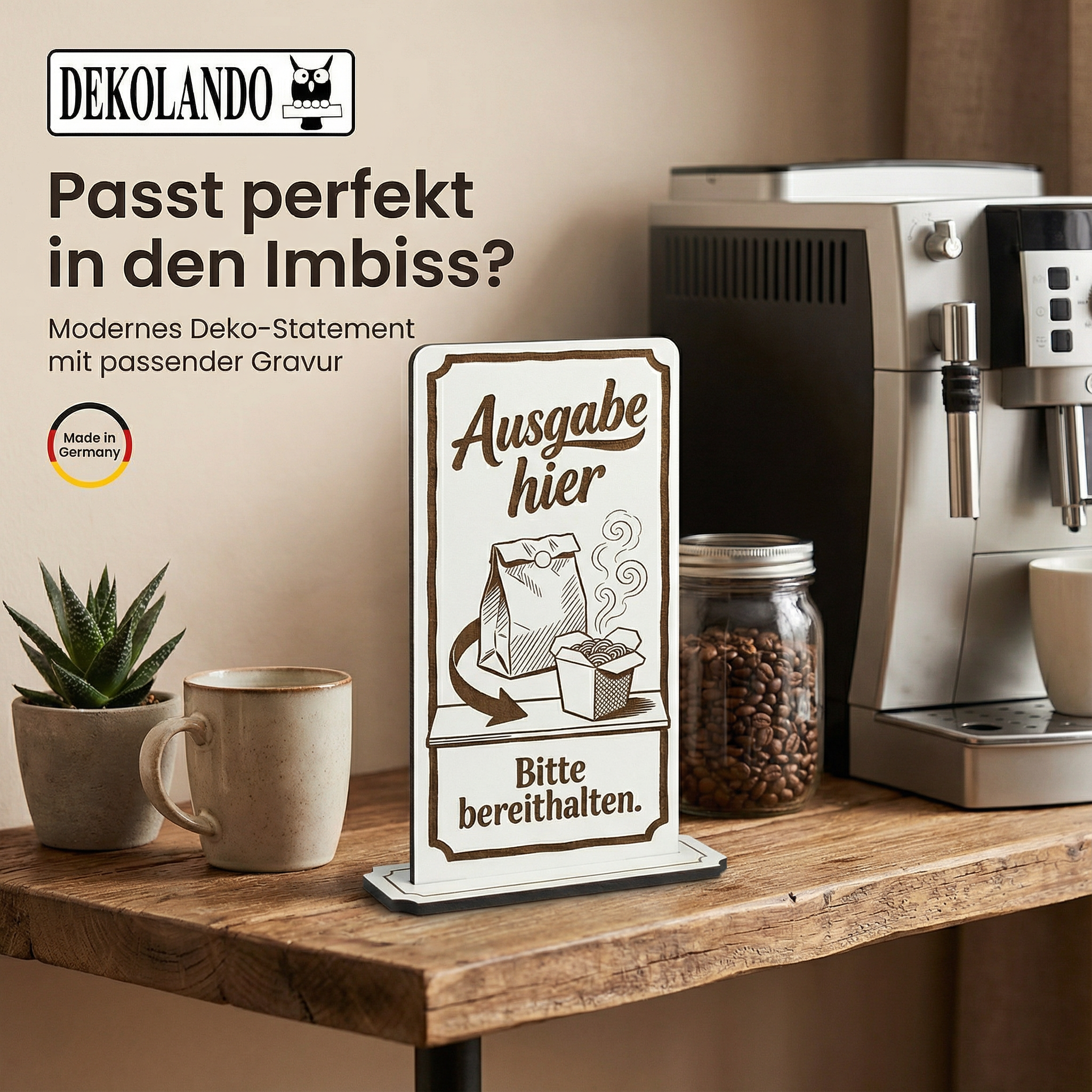 - MOTIV AUSGABE-HINWEIS: Aufsteller Schild mit Gravur „Ausgabe hier! Bitte hier abholen.“ – perfekt zur Lenkung der Abholung an Ausgabe, Theke, Tresen oder Abholstation im Imbiss/Bistro.