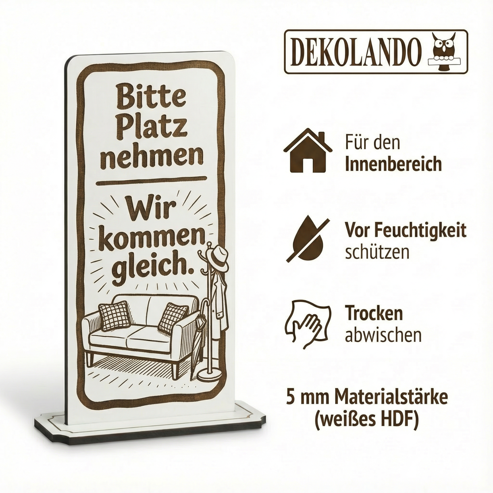 WICHTIGER HINWEIS (HDF): HDF ist nicht wasserfest – bitte vor Feuchtigkeit/Nässe schützen und nicht dauerhaft feucht reinigen; so bleibt der Aufsteller lange schön