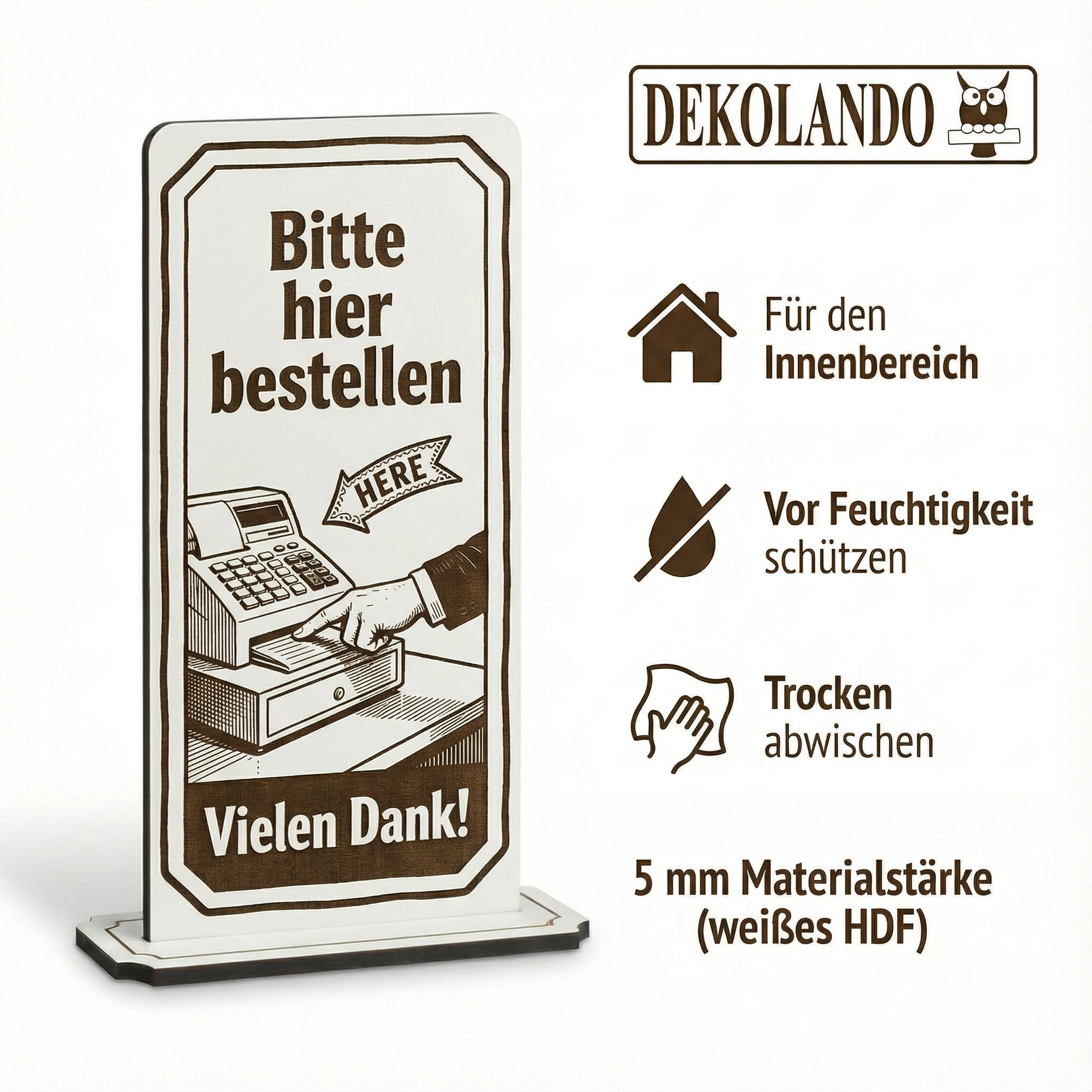 WICHTIGER HINWEIS (HDF): HDF ist nicht wasserfest – bitte vor Feuchtigkeit/Nässe schützen und nicht dauerhaft feucht reinigen; so bleibt der Aufsteller lange schön