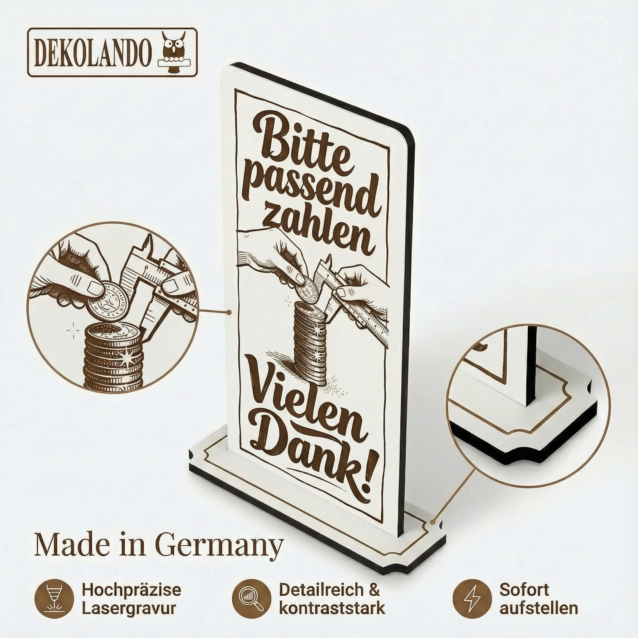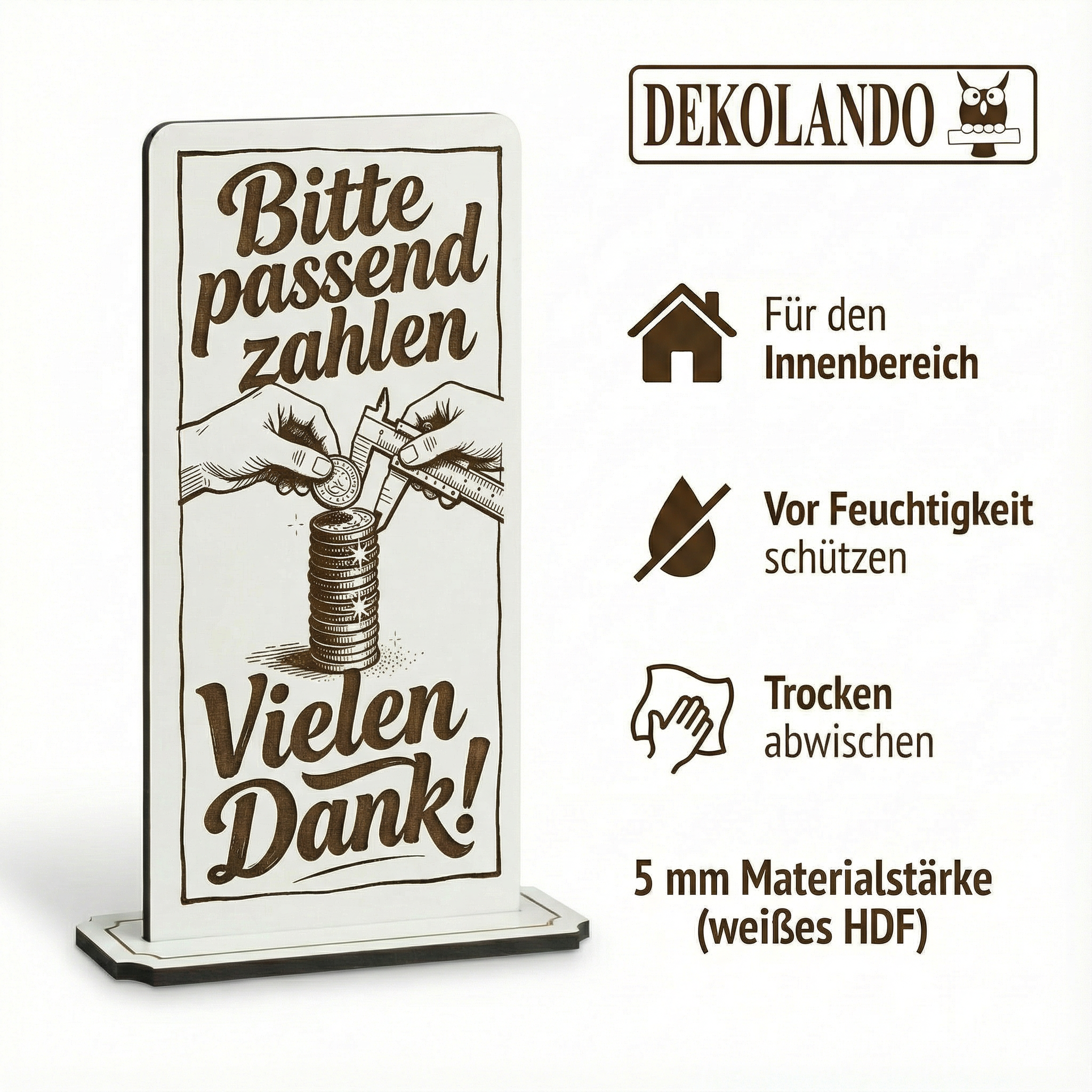 HOCHWERTIGES MATERIAL: 5 mm weißes HDF mit brauner Rückseite, präzise Lasergravur, schwarze Schnittkante, oben abgerundete Form – dekorativ, klar und zeitlos.