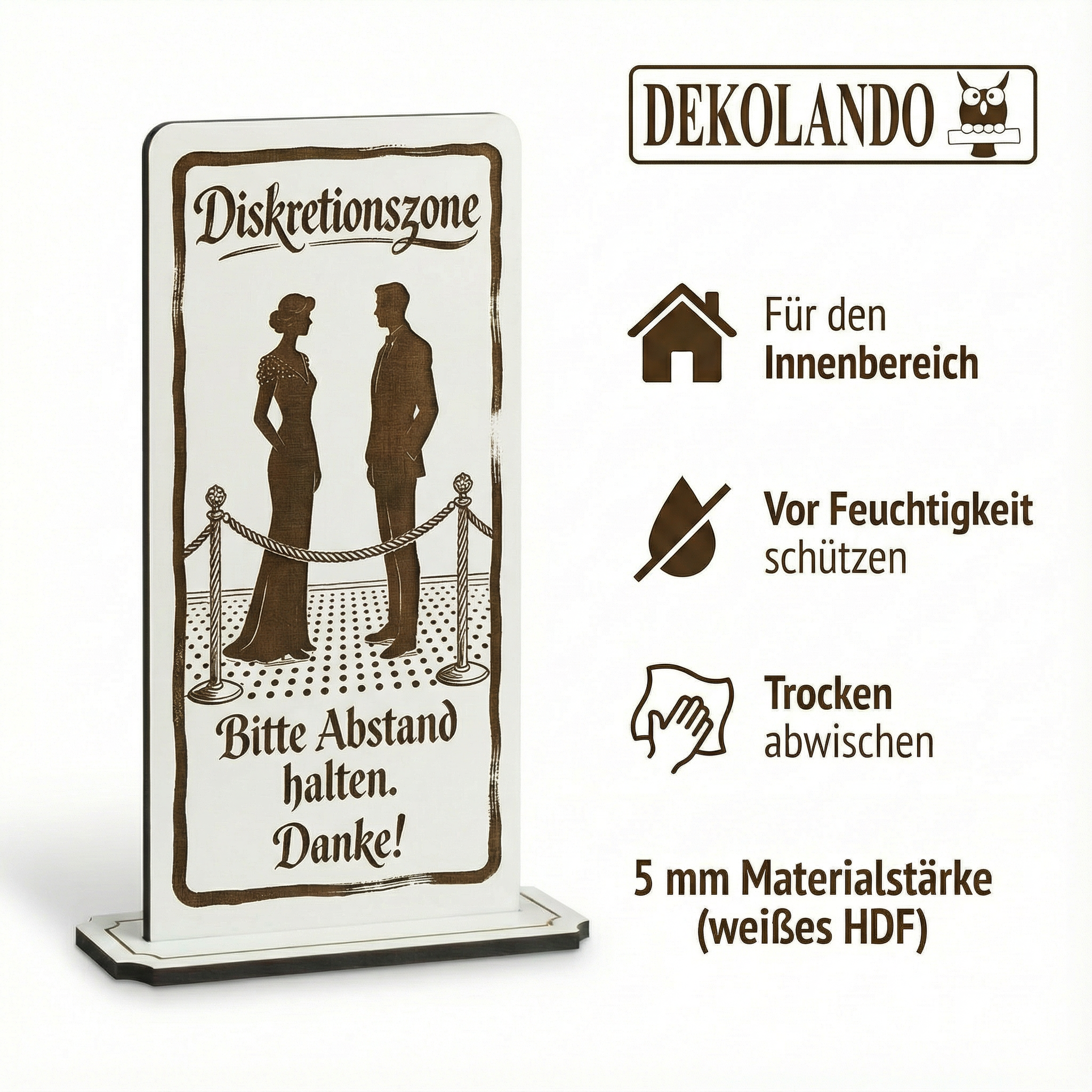 WICHTIGER HINWEIS (HDF): HDF ist nicht wasserfest – bitte vor Feuchtigkeit/Nässe schützen und nicht dauerhaft feucht reinigen; so bleibt der Aufsteller lange schön