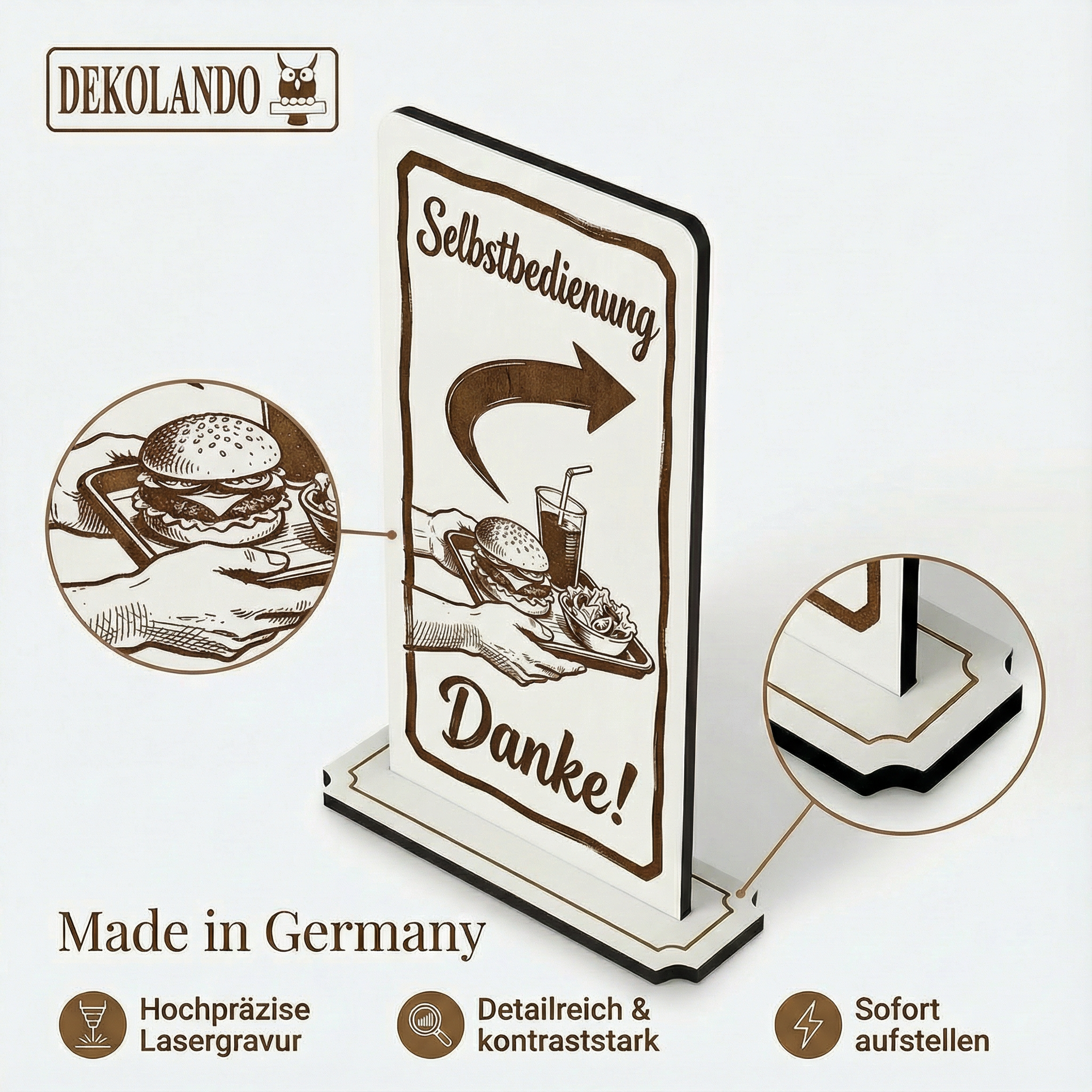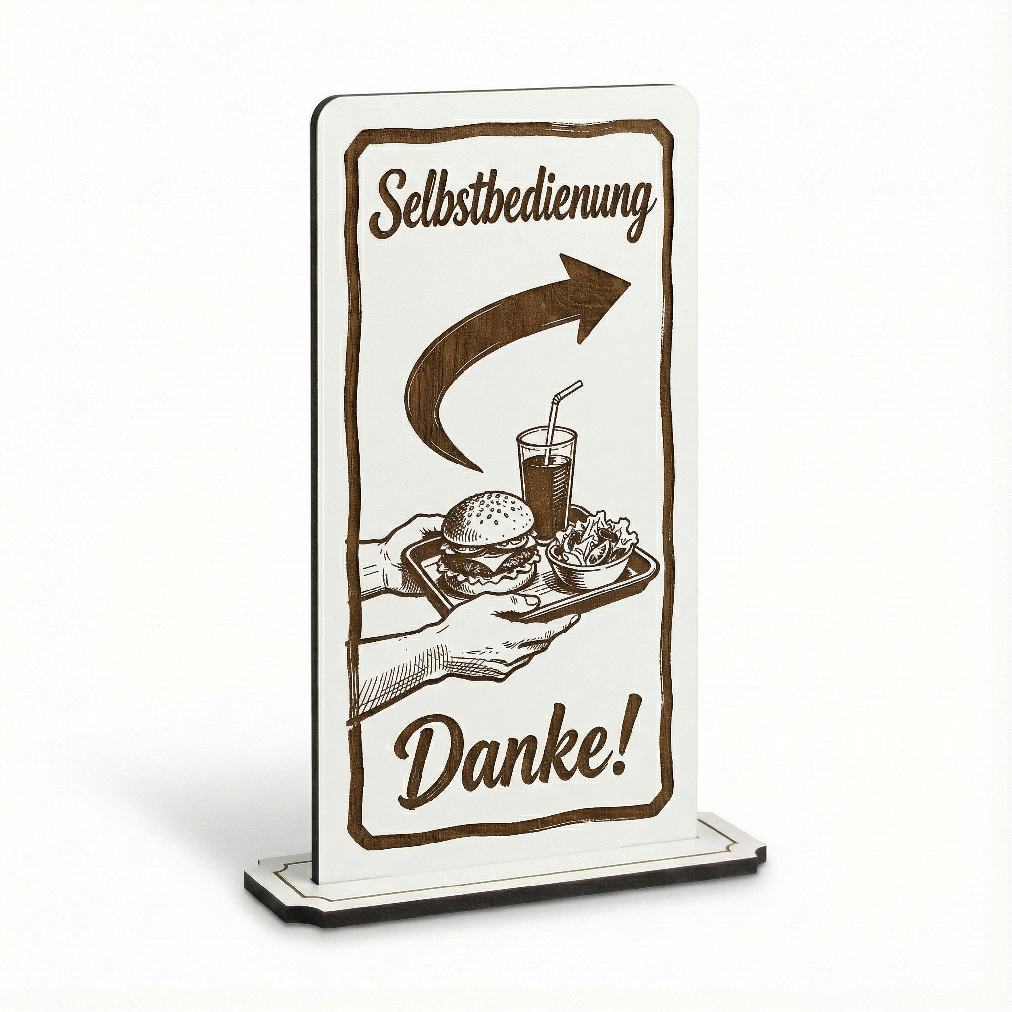 - MOTIV SELBSTBEDIENUNG: Aufsteller Schild mit Gravur „Selbstbedienung“ – ideal für Bäckerei, Imbiss, Café, Theke oder SB-Bereich.