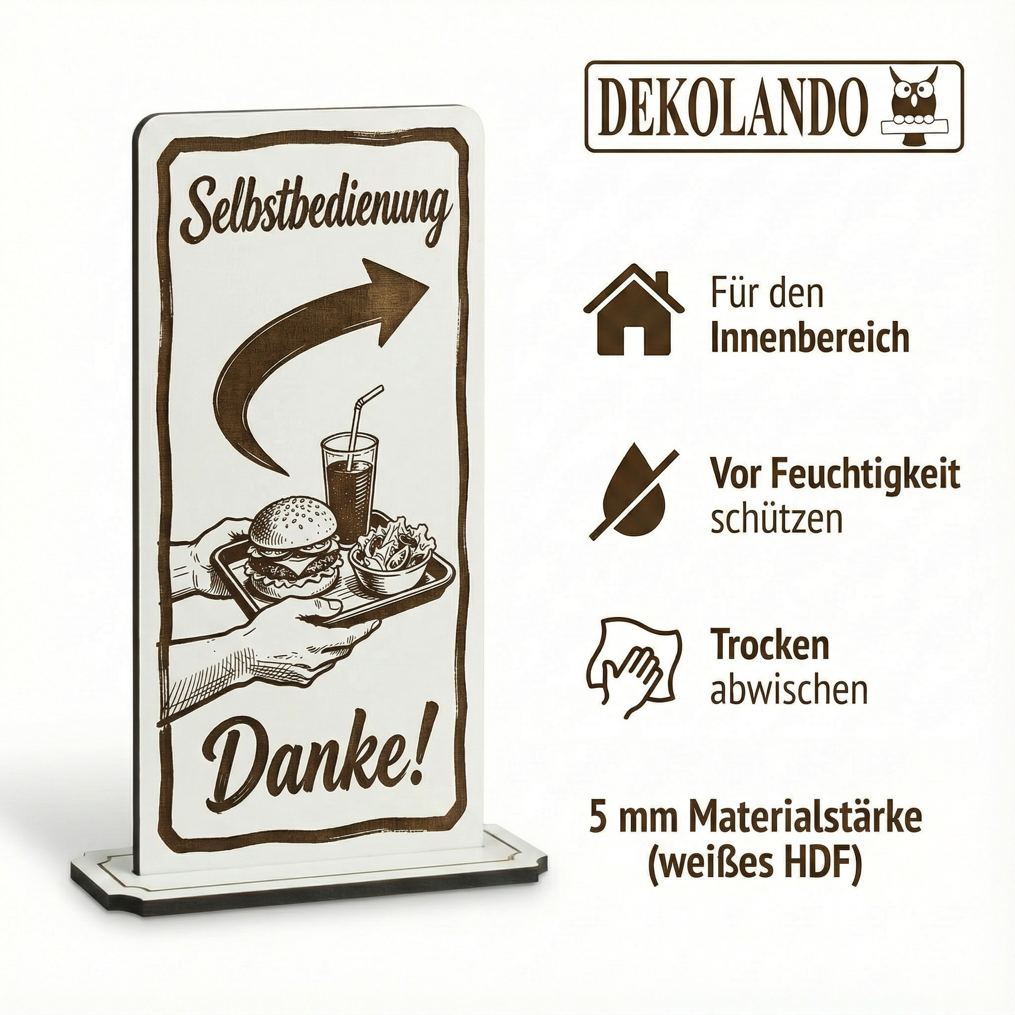 WICHTIGER HINWEIS (HDF): HDF ist nicht wasserfest – bitte vor Feuchtigkeit/Nässe schützen und nicht dauerhaft feucht reinigen; so bleibt der Aufsteller lange schön
