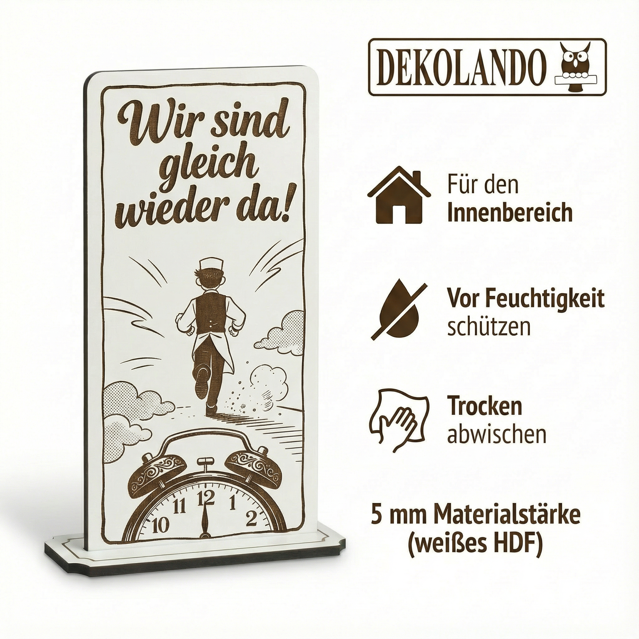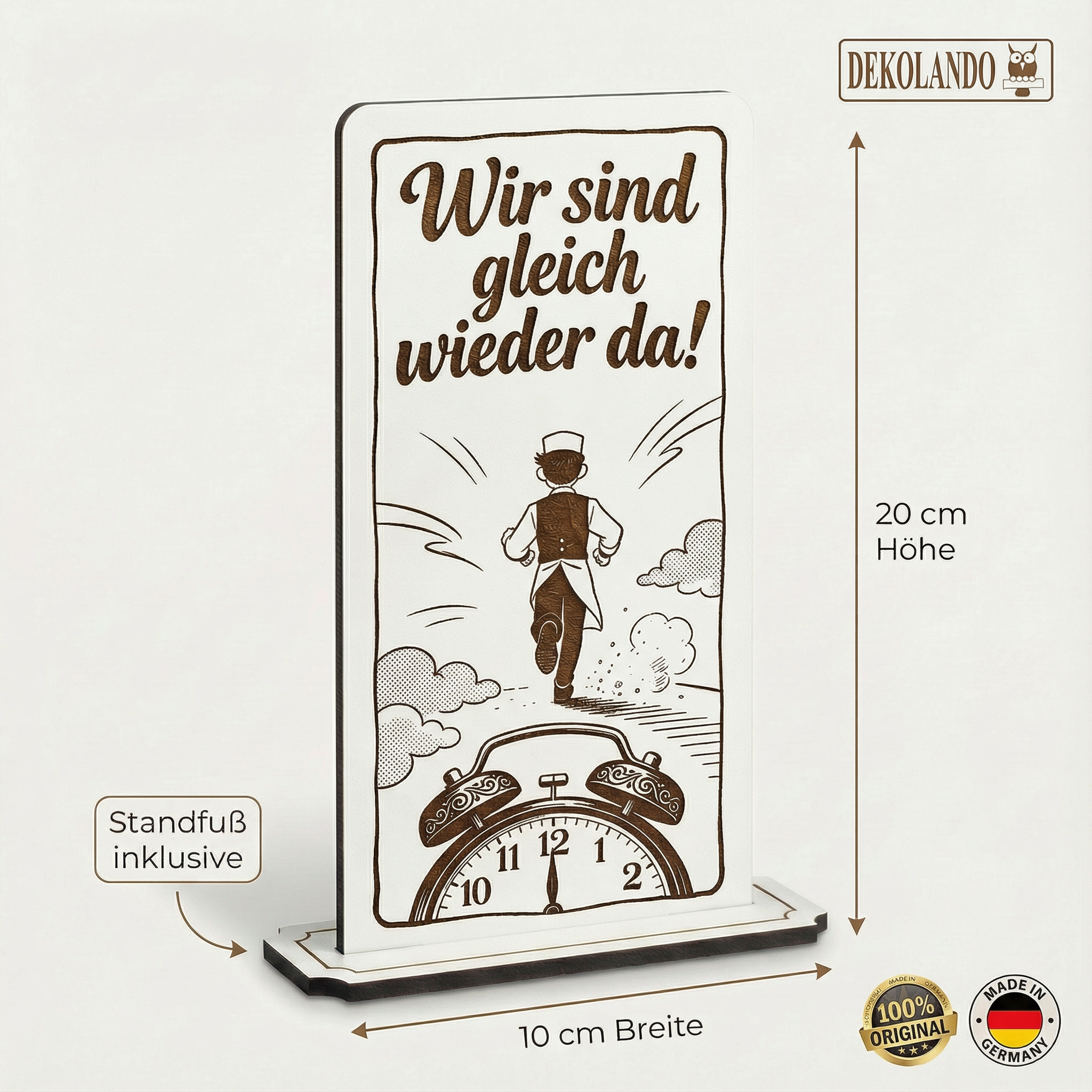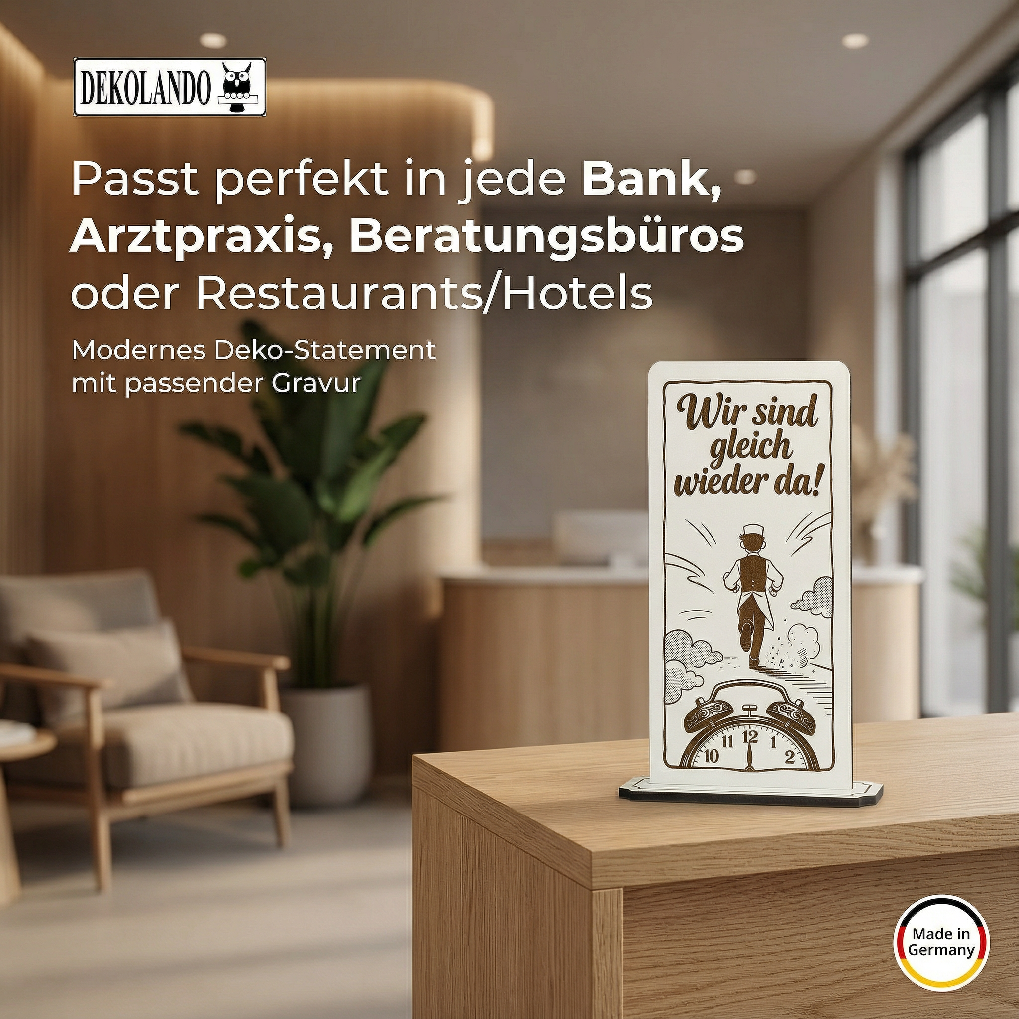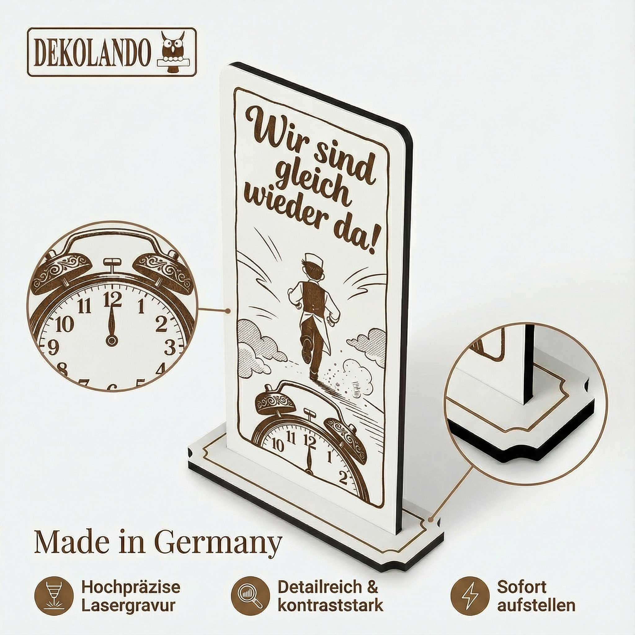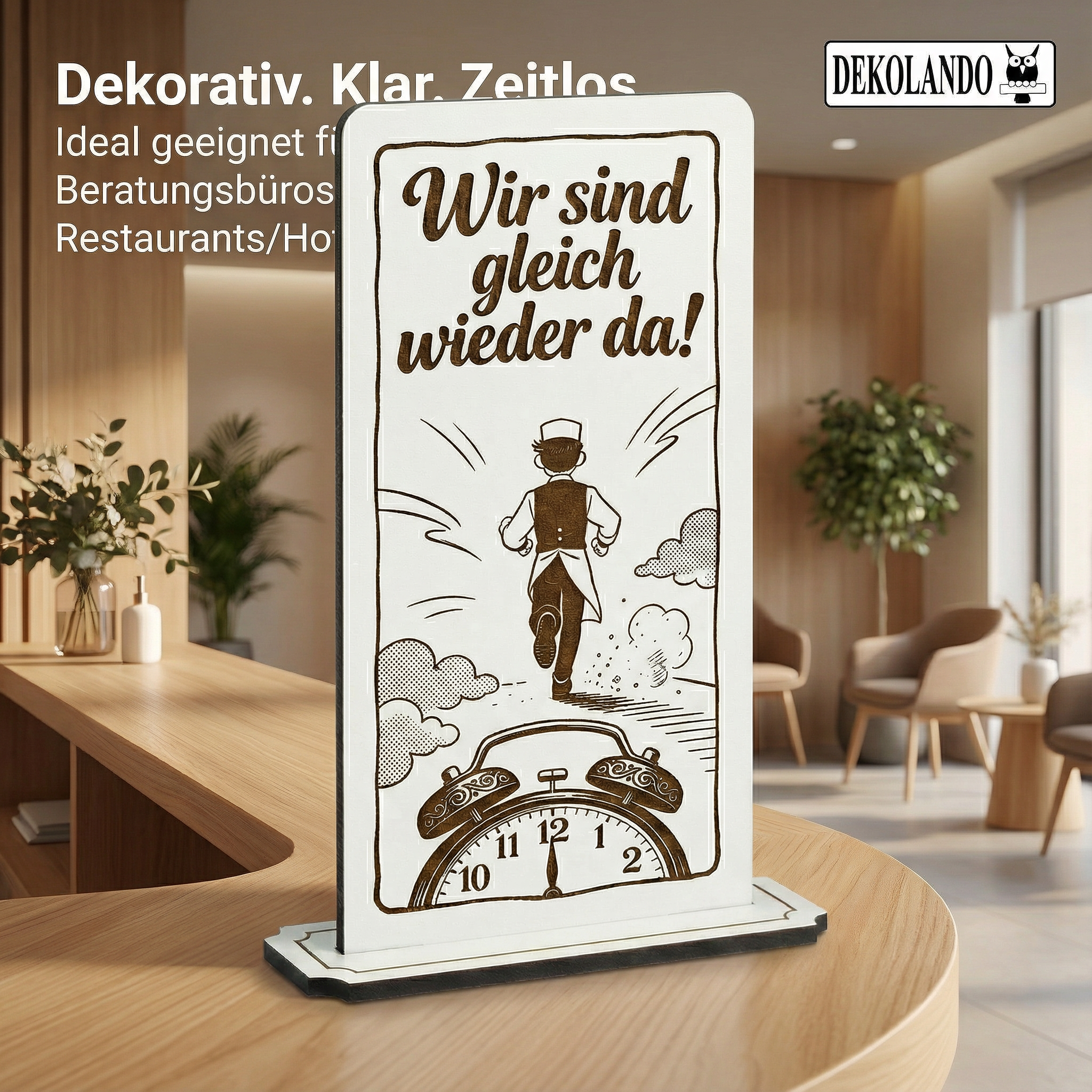 - MOTIV WIR SIND GLEICH WIEDER DA: Aufsteller Schild mit Gravur „Wir sind gleich wieder da“ – gut sichtbar an Kasse, Theke, Rezeption oder Eingang.