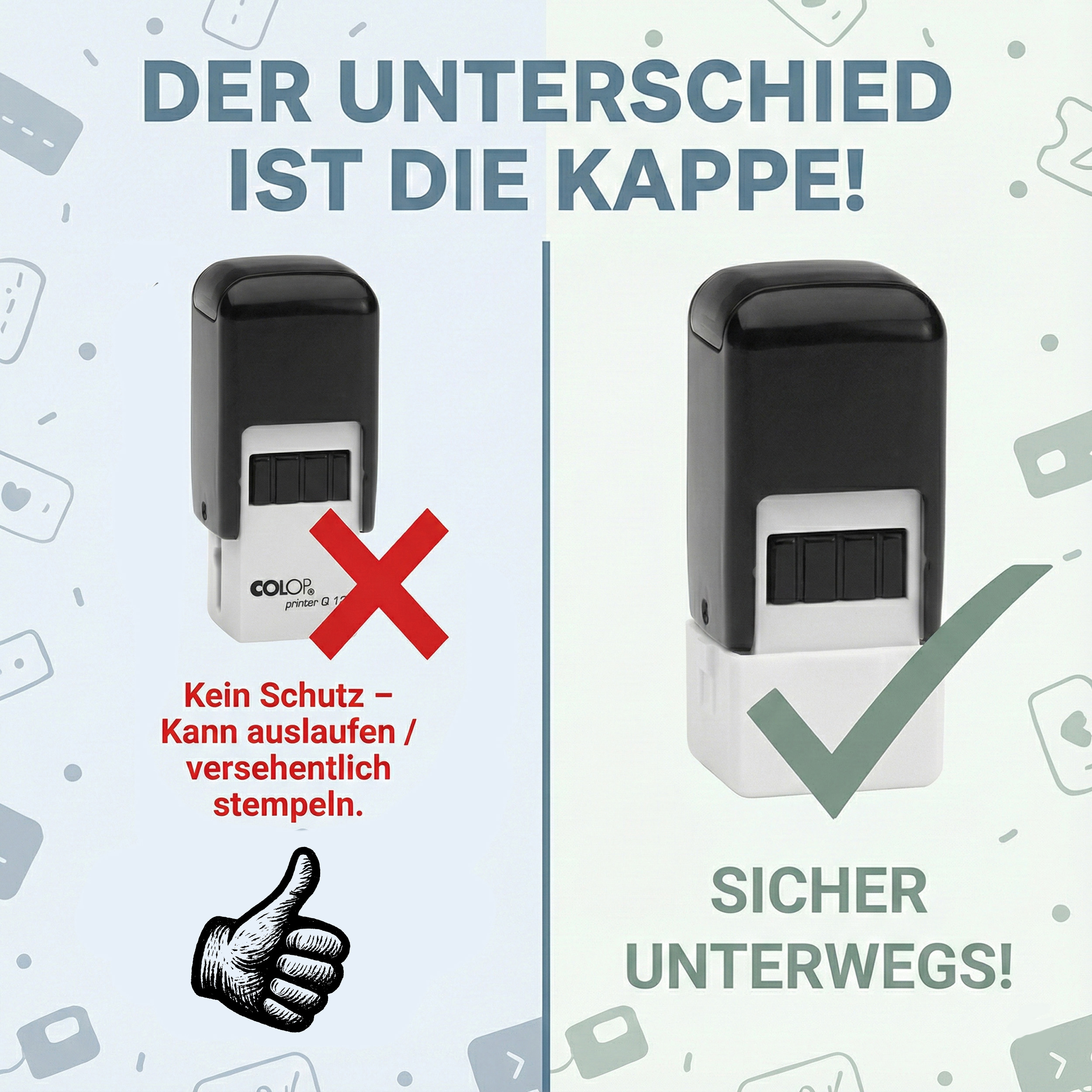 Dank der praktischen Schutzkappe ist der Stamper sicher für den Transport in Schublade, Rucksack oder Hosentasche. Kein Auslaufen und kein versehentliches Stempeln – perfekt für Mitarbeiter im Verkauf, Service, Handel oder für mobile Einsätze.