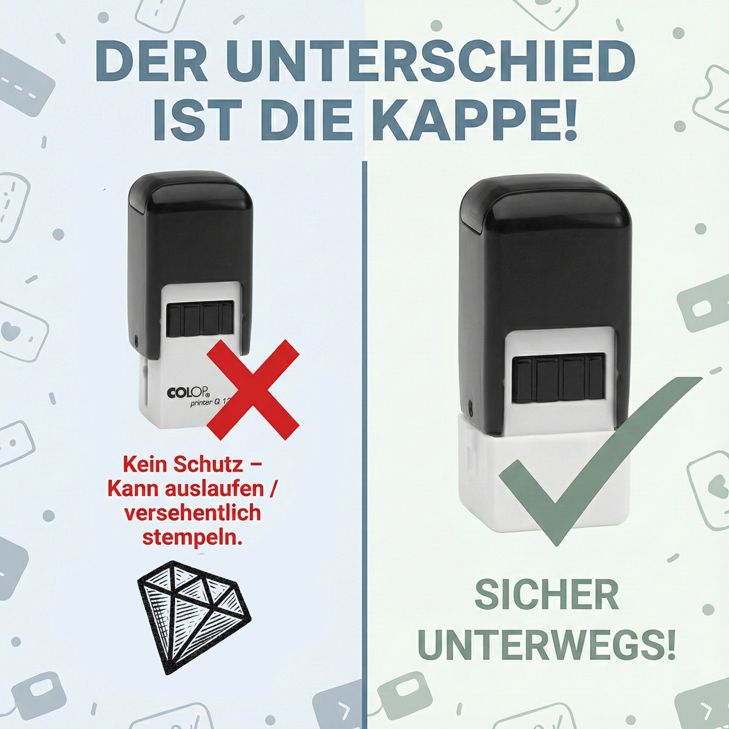 Dank der praktischen Schutzkappe ist der Stamper sicher für den Transport in Schublade, Rucksack oder Hosentasche. Kein Auslaufen und kein versehentliches Stempeln – perfekt für Mitarbeiter im Verkauf, Service, Handel oder für mobile Einsätze.