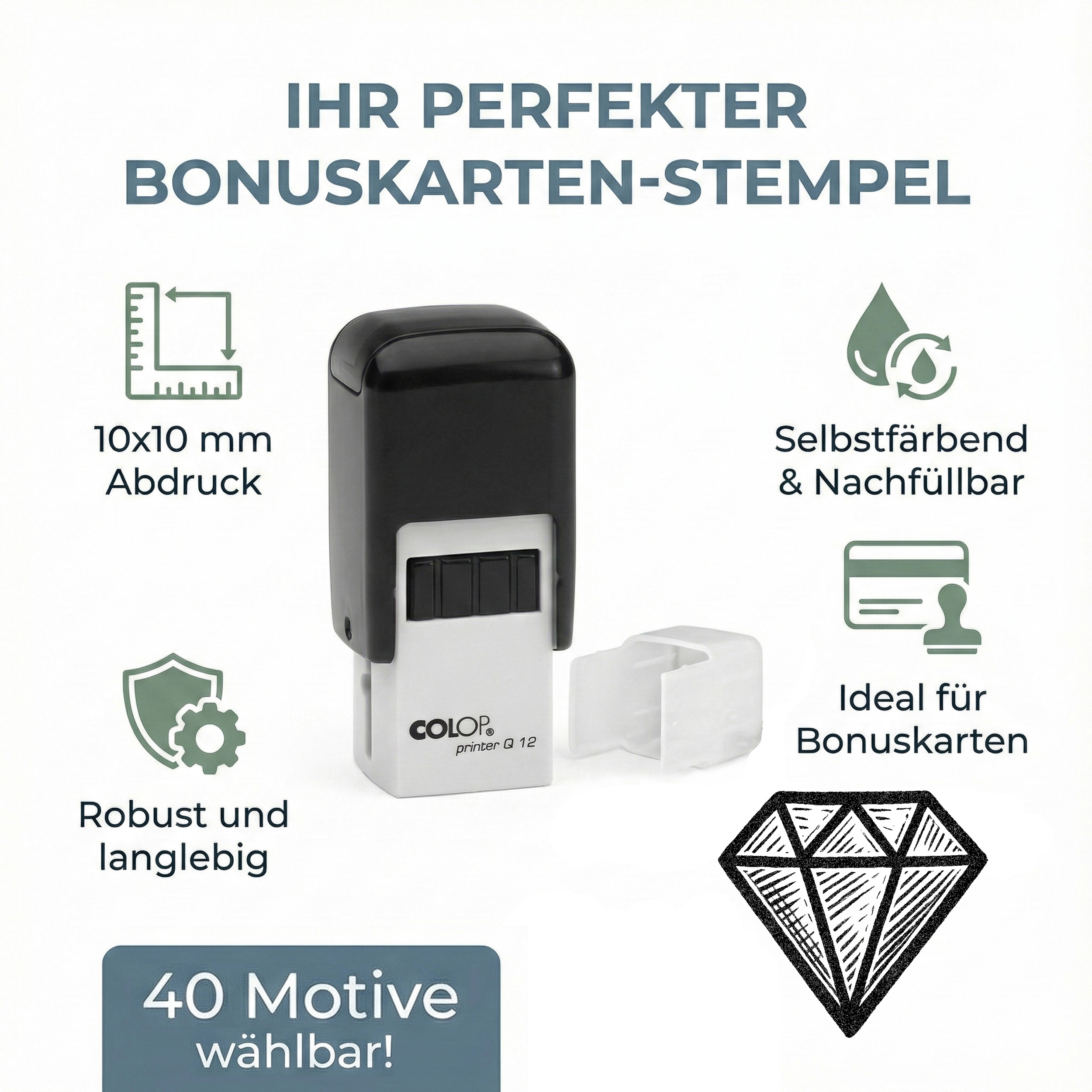 - Bonusstempel Diamant 10x10 mm – ideal für Bonuskarte, Kundenkarte, Stempelkarte & Terminkarten im Juwelier, Schmuckladen, Goldschmied, Edelsteinhandel. Scharfer Rundstempel für klare, professionelle Abdrucke