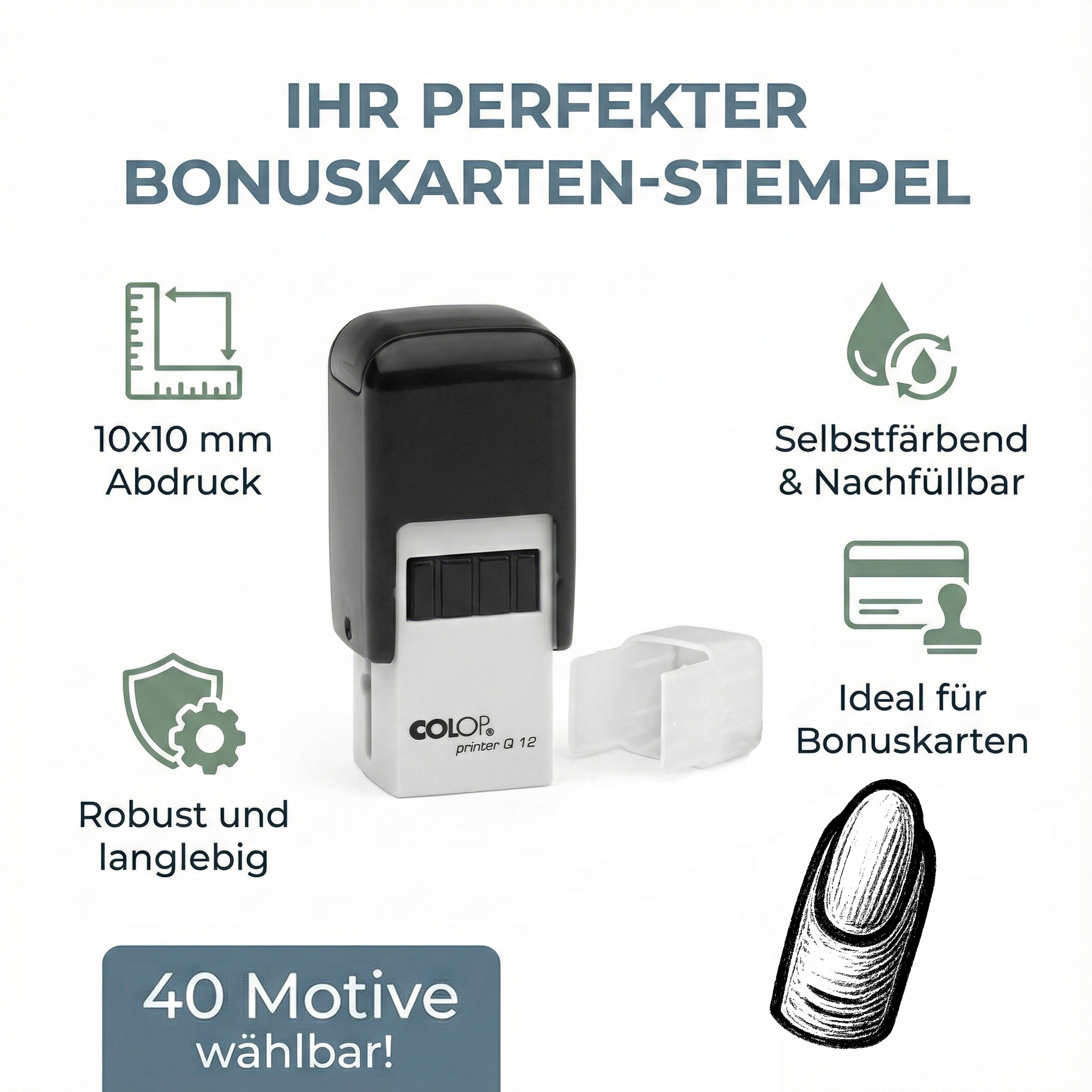 - Selbstfärbender Bonuskartenstempel mit langlebigem, austauschbarem Stempelkissen – sehr einfach zu wechseln. Bis zu 1.000 Abdrucke - nachhaltig und langlebig