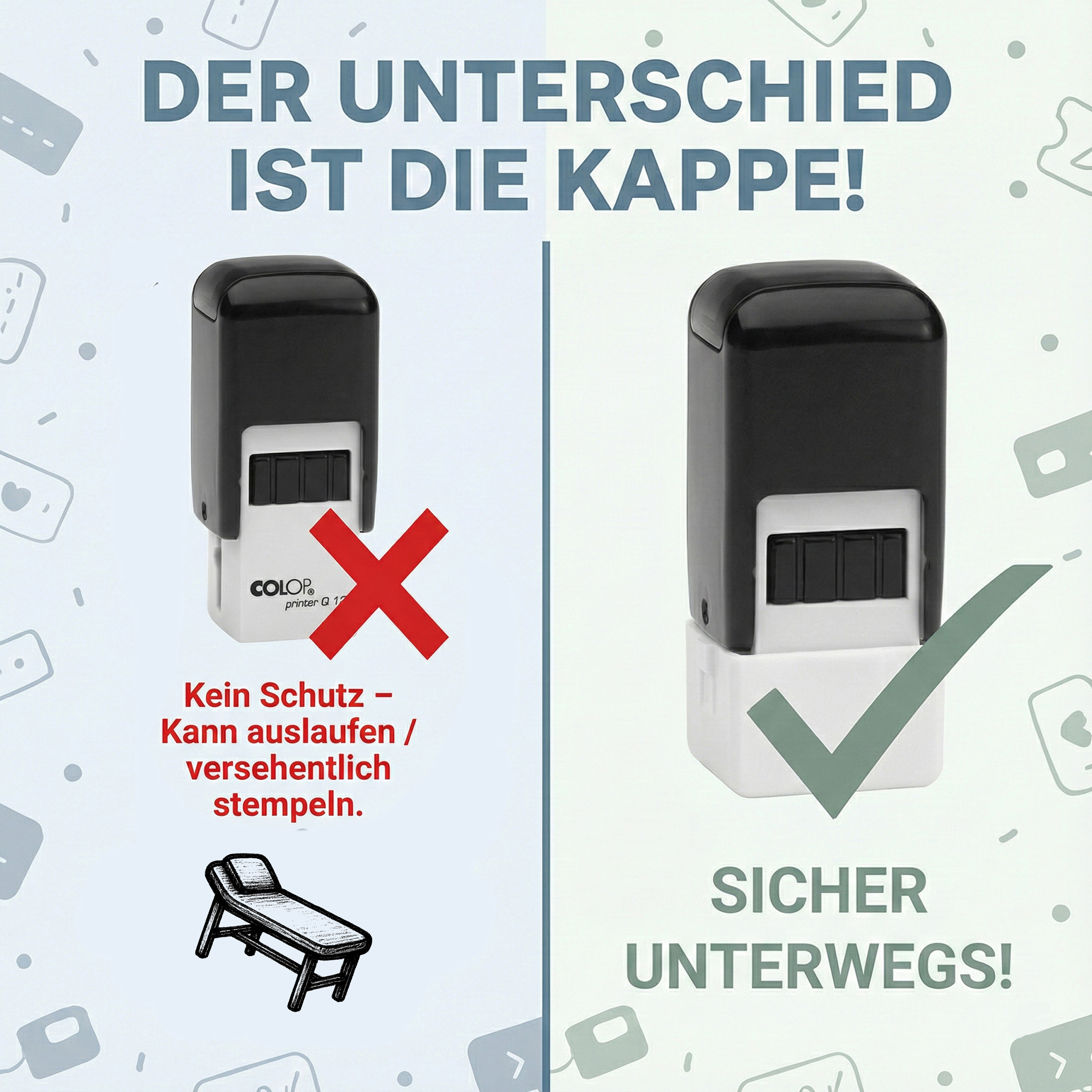 Dank der praktischen Schutzkappe ist der Stamper sicher für den Transport in Schublade, Rucksack oder Hosentasche. Kein Auslaufen und kein versehentliches Stempeln – perfekt für Mitarbeiter im Verkauf, Service, Handel oder für mobile Einsätze.