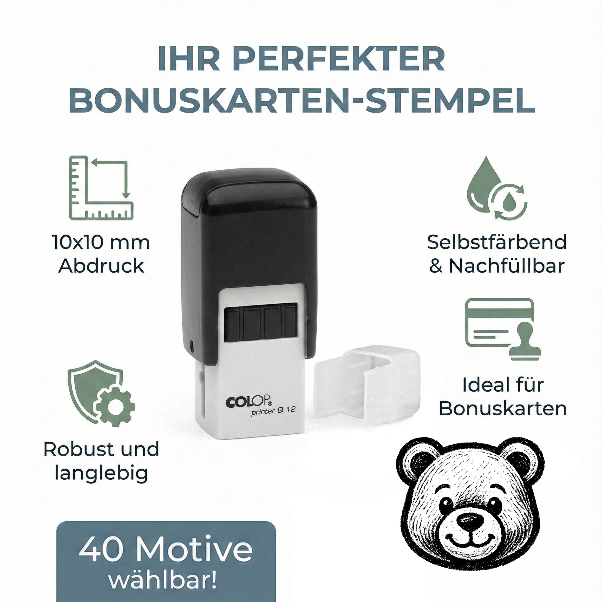 Bonusstempel Teddy Bär 10x10 mm – ideal für Bonuskarte, Kundenkarte, Stempelkarte & Terminkarten im Spielzeugladen, Kinderladen, Babyshop, Geschenkeshop. Scharfer Rundstempel für klare, professionelle Abdrucke