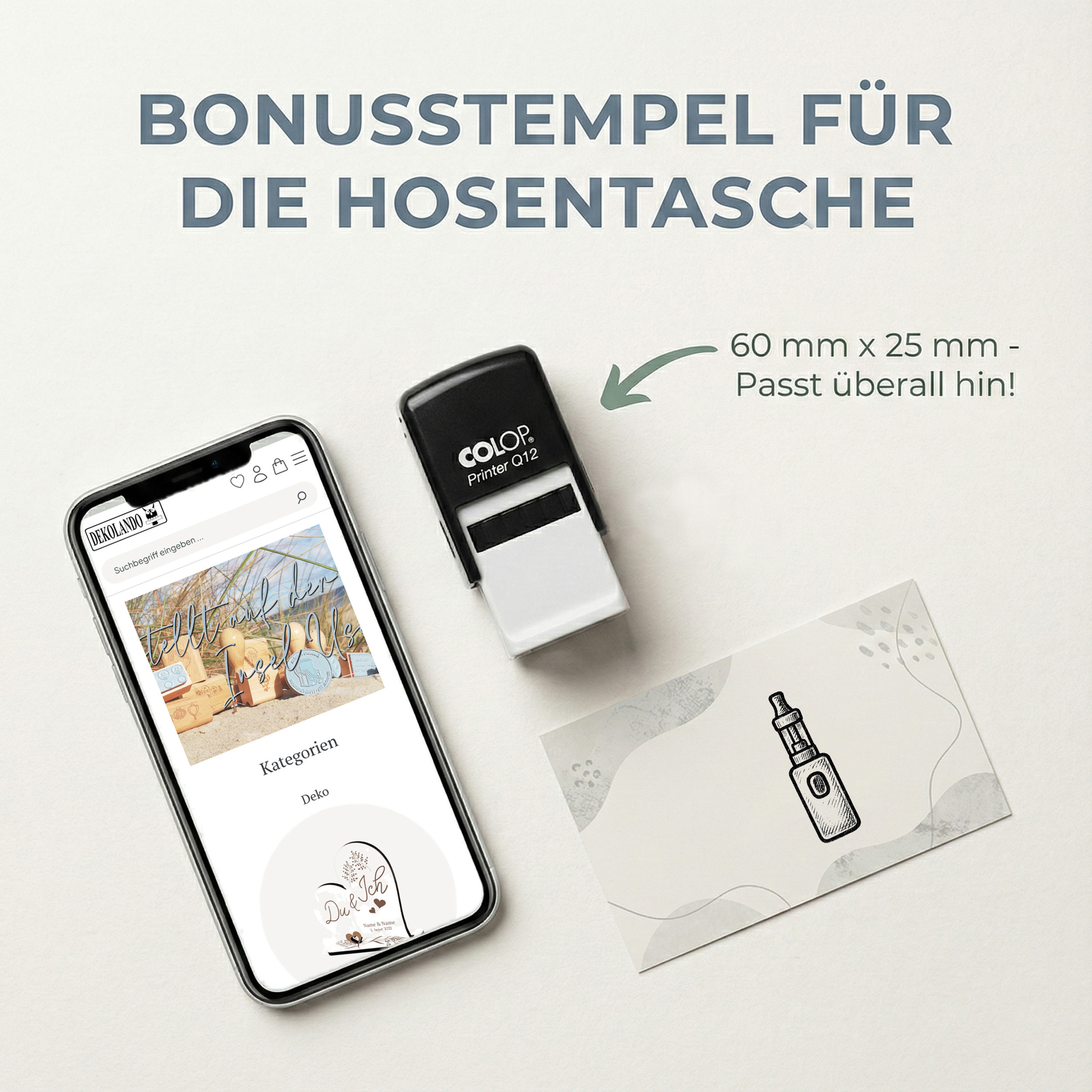 - Kompakter Stamper (60 × 25 × 25 mm) – robust, leicht & ideal für unterwegs; ideal für Gutscheine, Bonuskarte, Kundenkarte, Stempelkarte, Terminkarten, Kundenbindung & Rabattaktionen