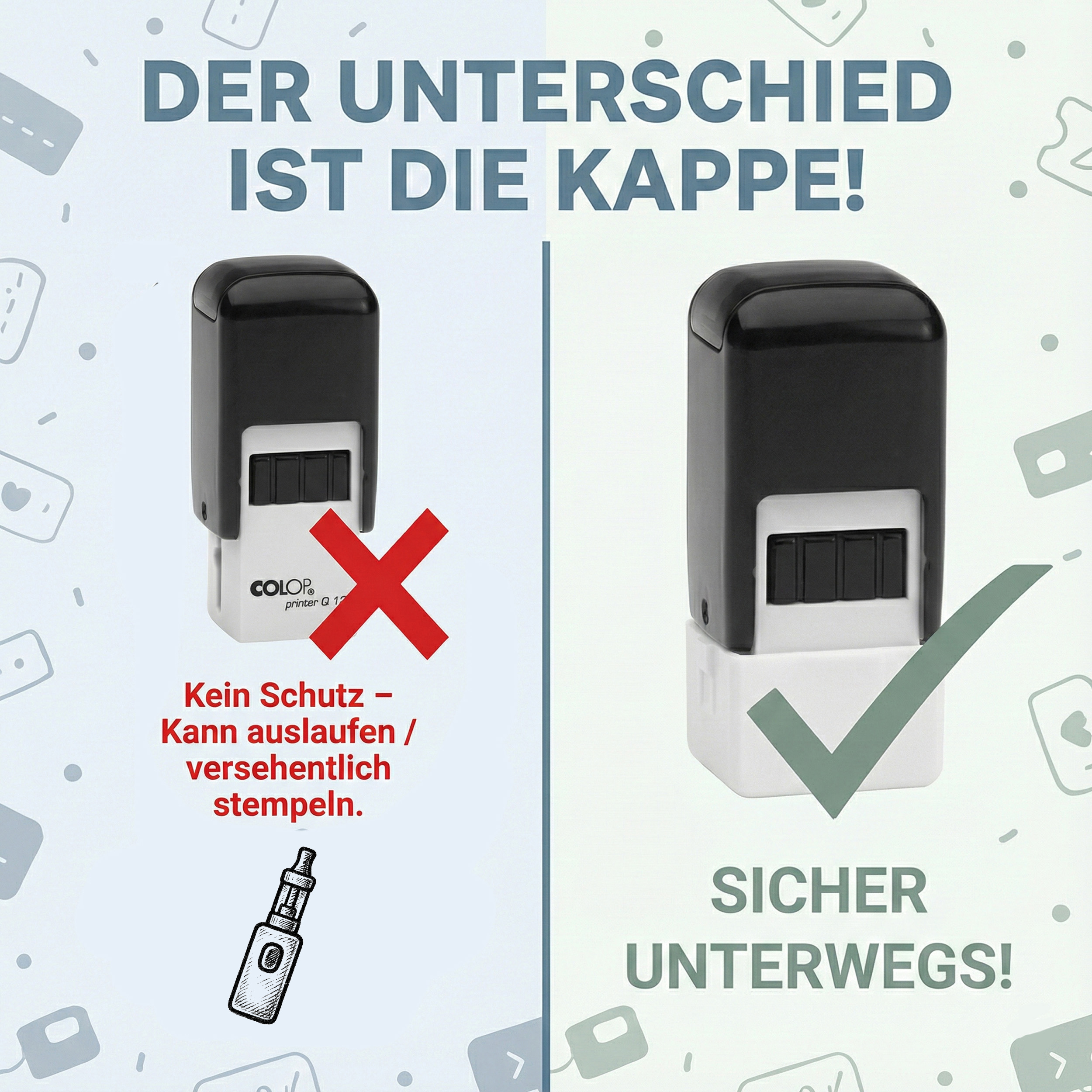 - Mit Schutzkappe für sauberen Transport – sicher in Tasche, Schublade oder Hosentasche; verhindert versehentliches Stempeln. Kein auslaufen - Keine verschmierten Finger
