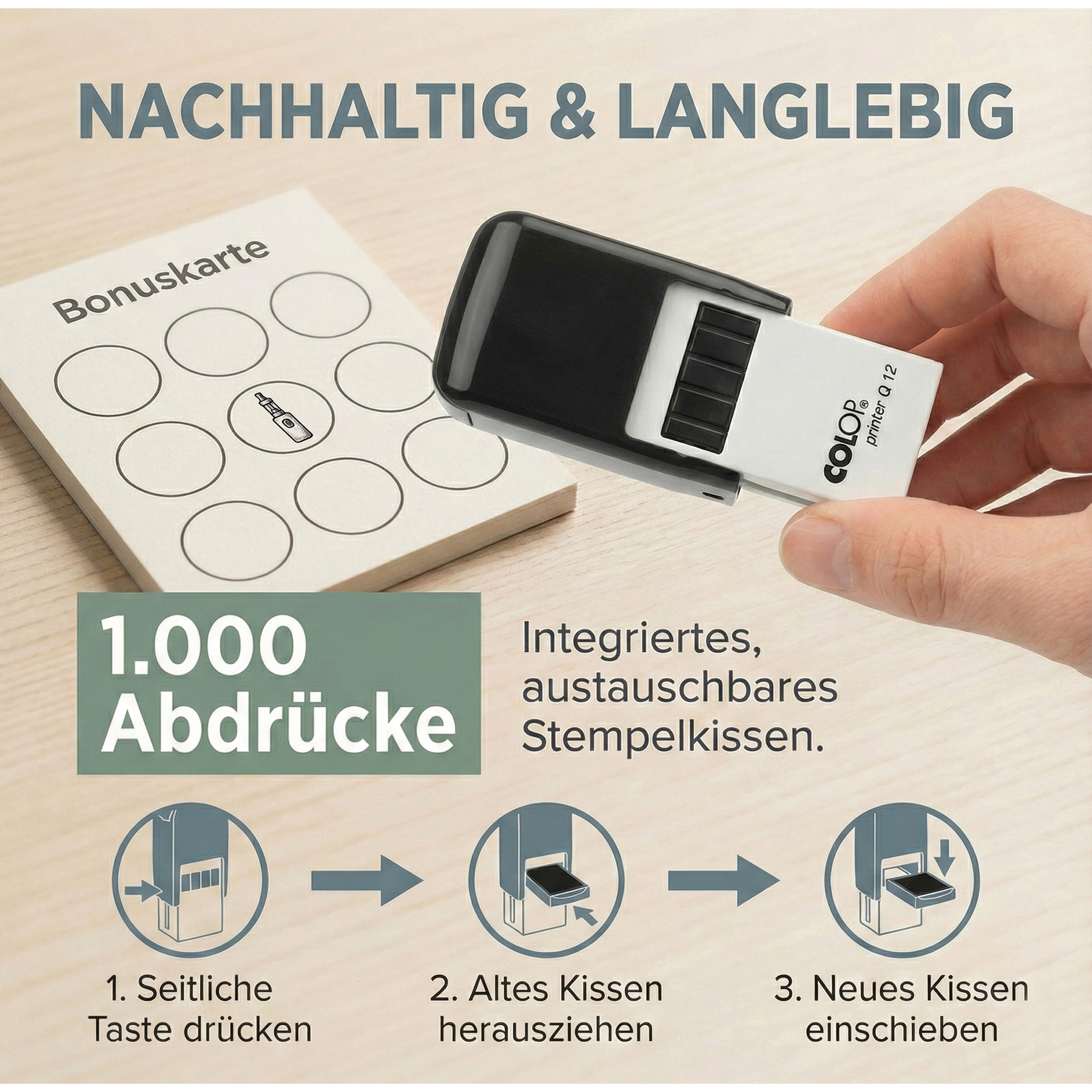 Der selbstfärbende Bonuskartenstempel ist mit einem integrierten, austauschbaren Stempelkissen ausgestattet, das bis zu 1.000 saubere Abdrucke ermöglicht. Das Kissen lässt sich mit einem Handgriff wechseln, sodass der Stempel langfristig nutzbar bleibt.
