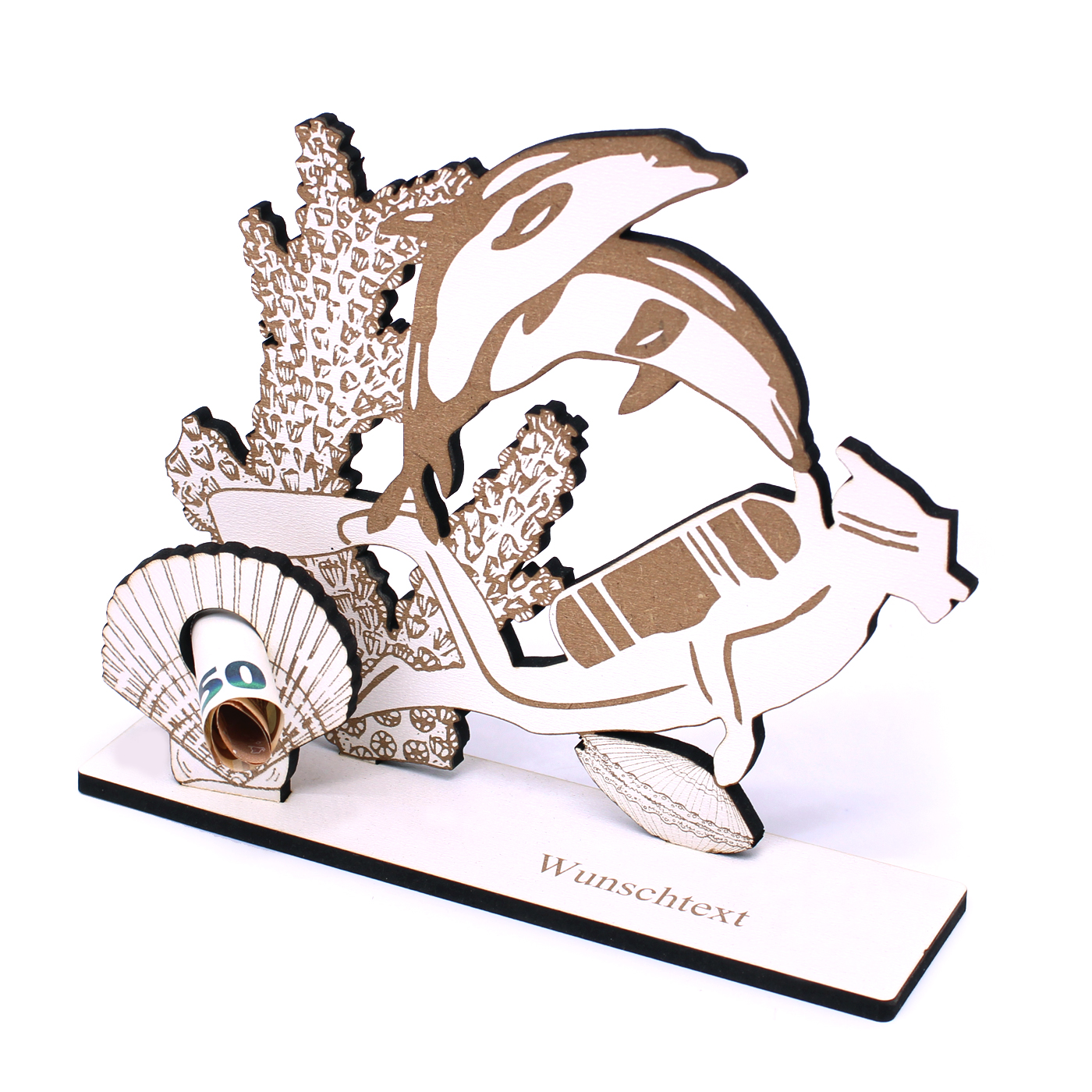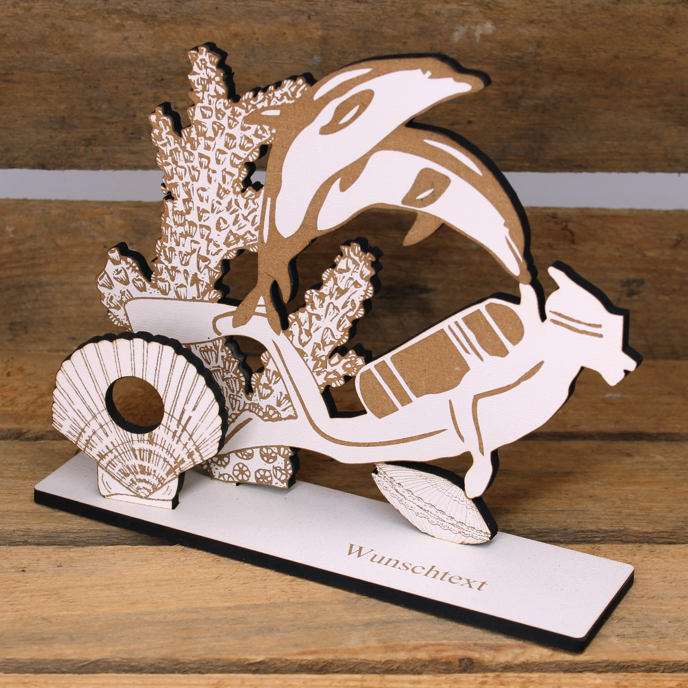 Dekoratives Schild zum Hinstellen in Form einer Unterwasserwelt mit einem Taucher, Delfinen, Korallen, Muscheln und persönlichem Wunschtext.