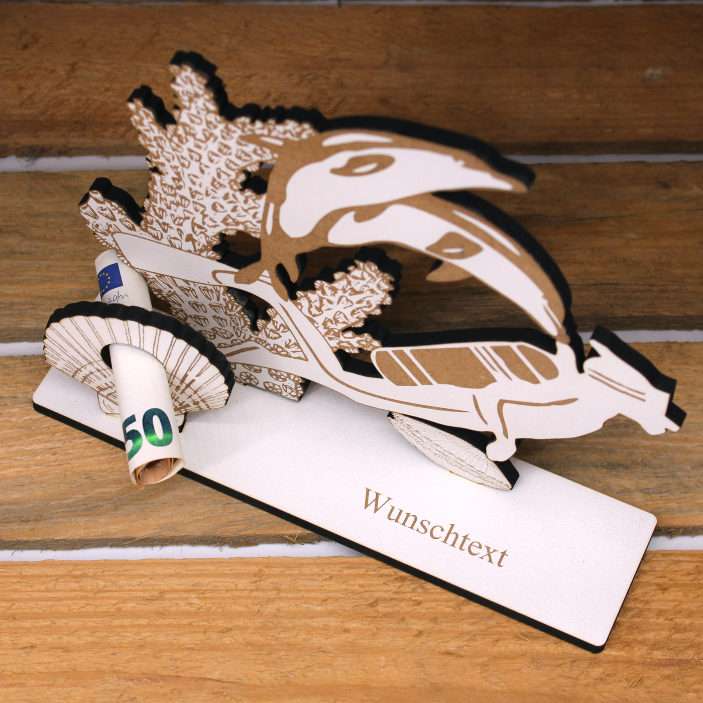 Geldgeschenk Tauchen - Taucher inkl. Wunschtext - Korallen Muscheln Delfine - Schild für Geld