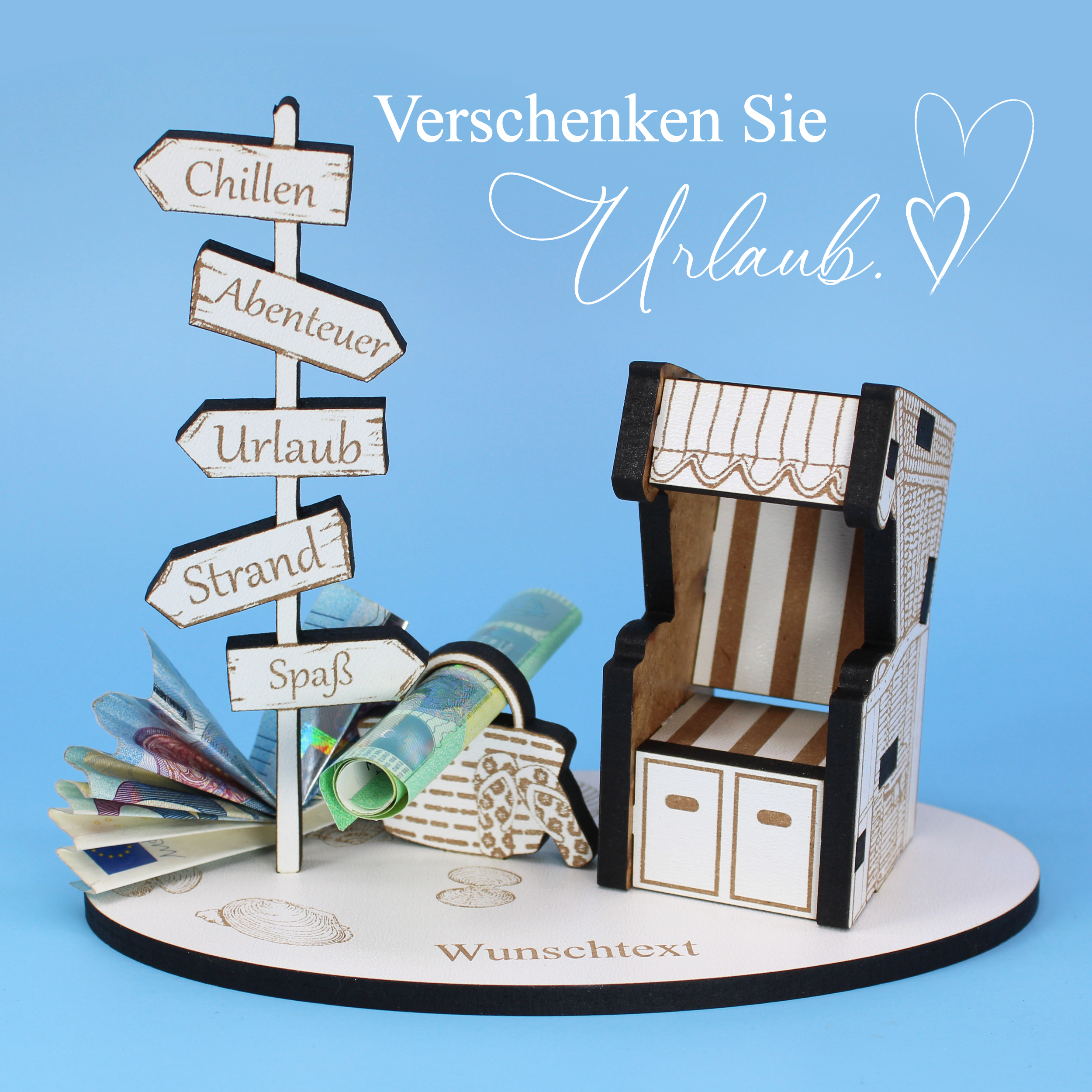 Personalisiertes Geld- & Gutscheingeschenk mit Wunschtext: Sie erhalten ein liebevoll gestaltetes Urlaubs-Geldgeschenk, das individuell mit Ihrem Wunschtext personalisiert wird. Ob Name, Datum oder persönlicher Gruß – die Gravur macht dieses Geschenk zu einem einzigartigen Unikat für besondere Anlässe.