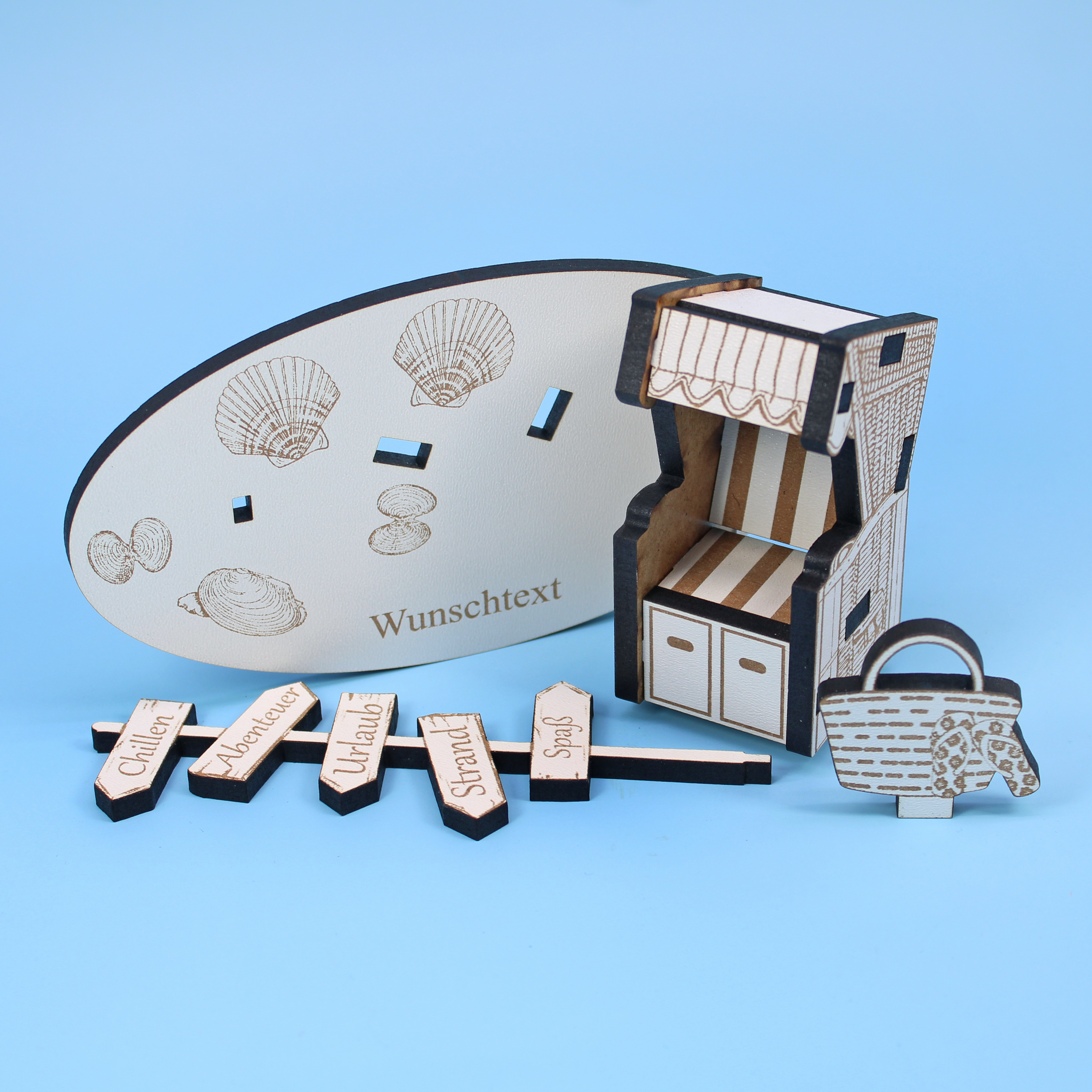 Urlaub Geldgeschenk Strandkorb mit Wegweisern - personalisiert mit Wunschtext - Schild für Geld Gutschein 15 x 12 cm